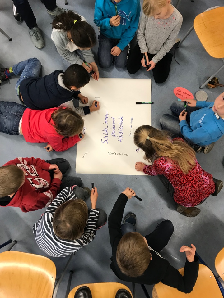 Das Schüler_innenparlament der Hardtschule gibt es seit Oktober 2018. Wir treffen uns alle drei Wochen für eine Unterrichtsstunde. Mit dabei sind Frau Ludvig, die Klassenlehrerin der 4. Klasse und Frau Kiehle, unsere Schulsozialarbeiterin.