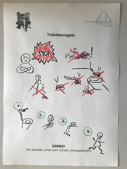 Das SchülerInnenparlament hat in den letzten Sitzungen bebilderte Regeln zur Toilettennnutzung erstellt, damit alle Kinder ohne Angst oder Ekel auf die Toiletten gehen können.