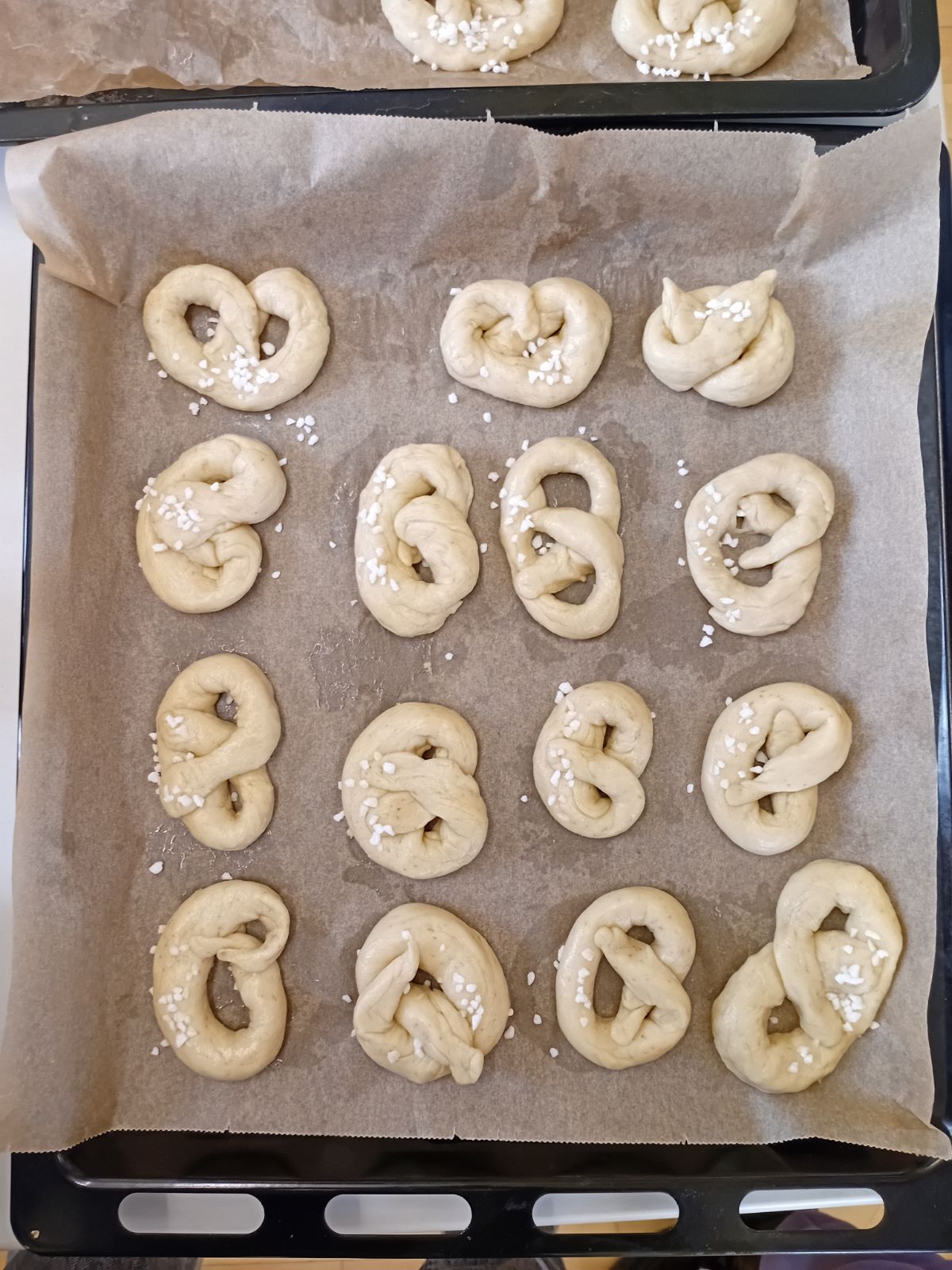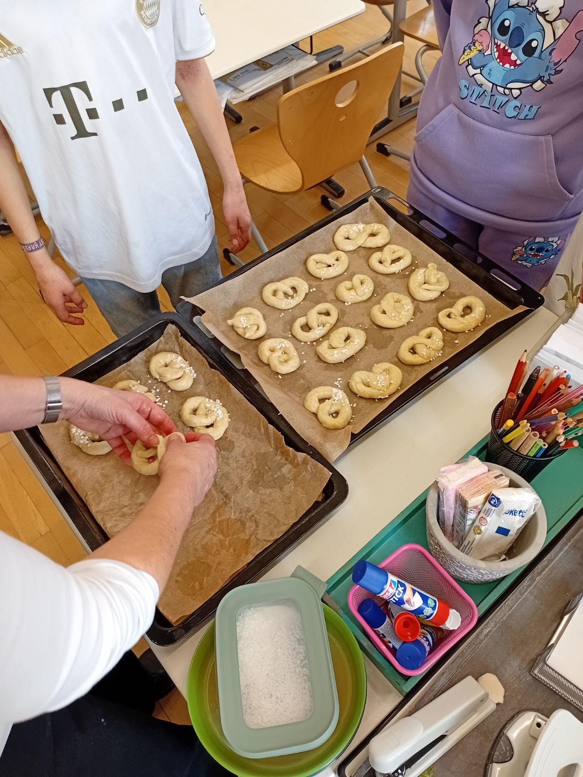 In der Woche nach den Weihnachtsferien haben die Kinder der 4b mit den Patenkindern aus der 1a gemeinsam Neujahrsbrezeln gebacken: Der Hefeteig wurde gewissenhaft geknetet, Brezeln wurden geformt (gar nicht so leicht!) und mit Zucker bestreut.